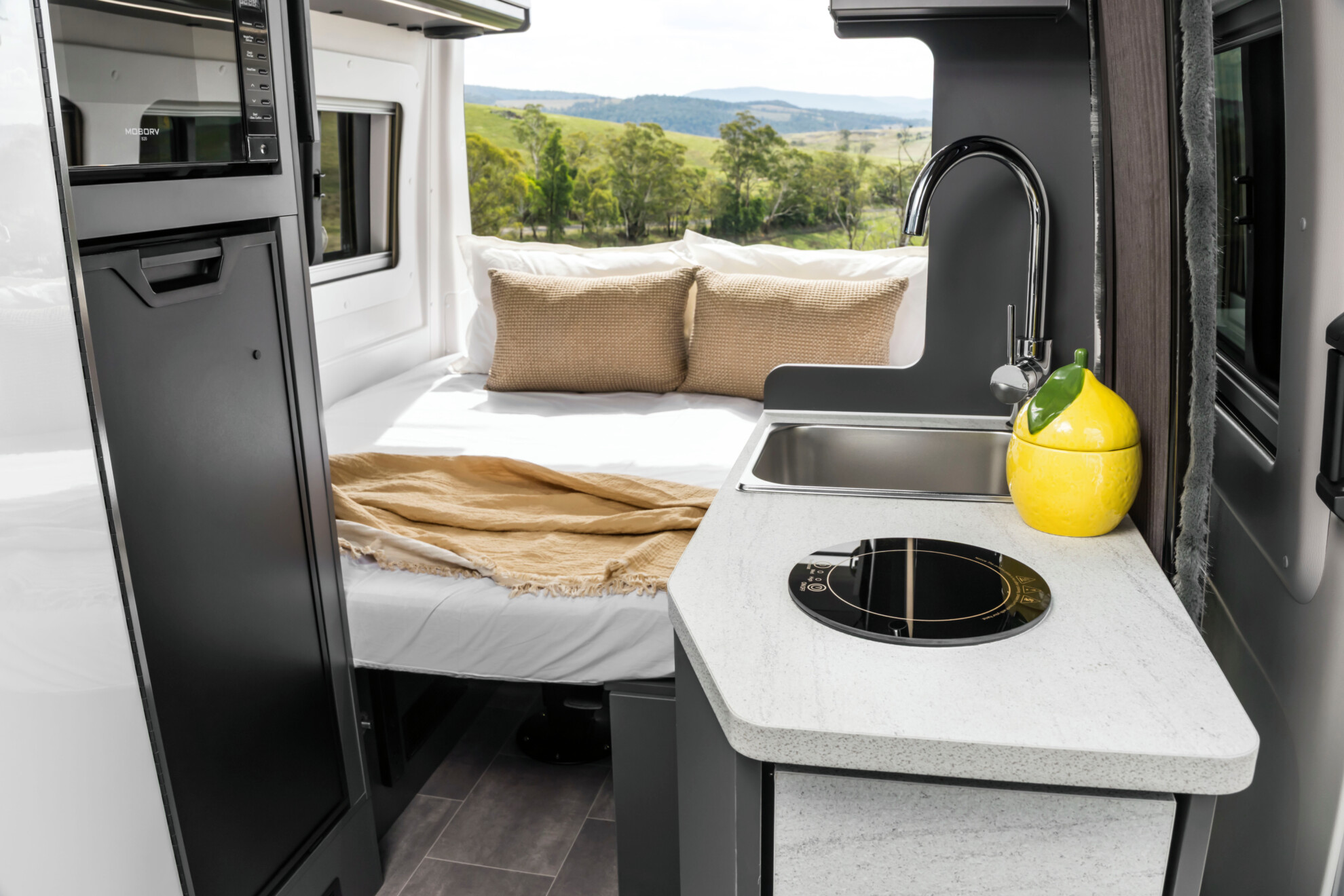 This has also resulted in the water outlets, external shower port, and grey water exit being moved to the driver’s side of the vehicle, while an under-bench drawer-style fridge and relocated bathroom also feature.