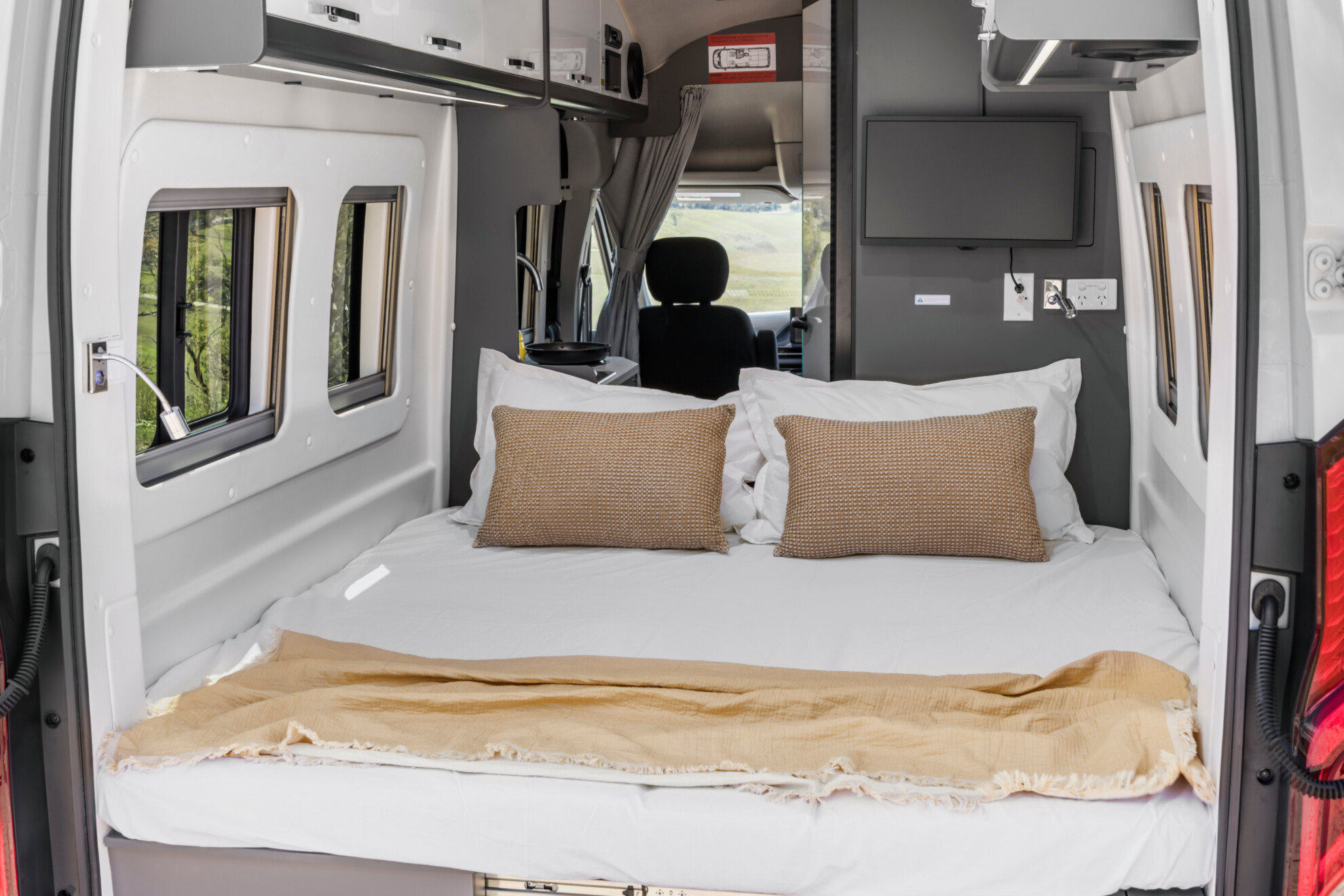 The new two-seater sees the bed layout changed from running across the van in an east-west configuration to being situated lengthways (north-south), providing more sleeping space, and more room for when it’s set up as a lounge.