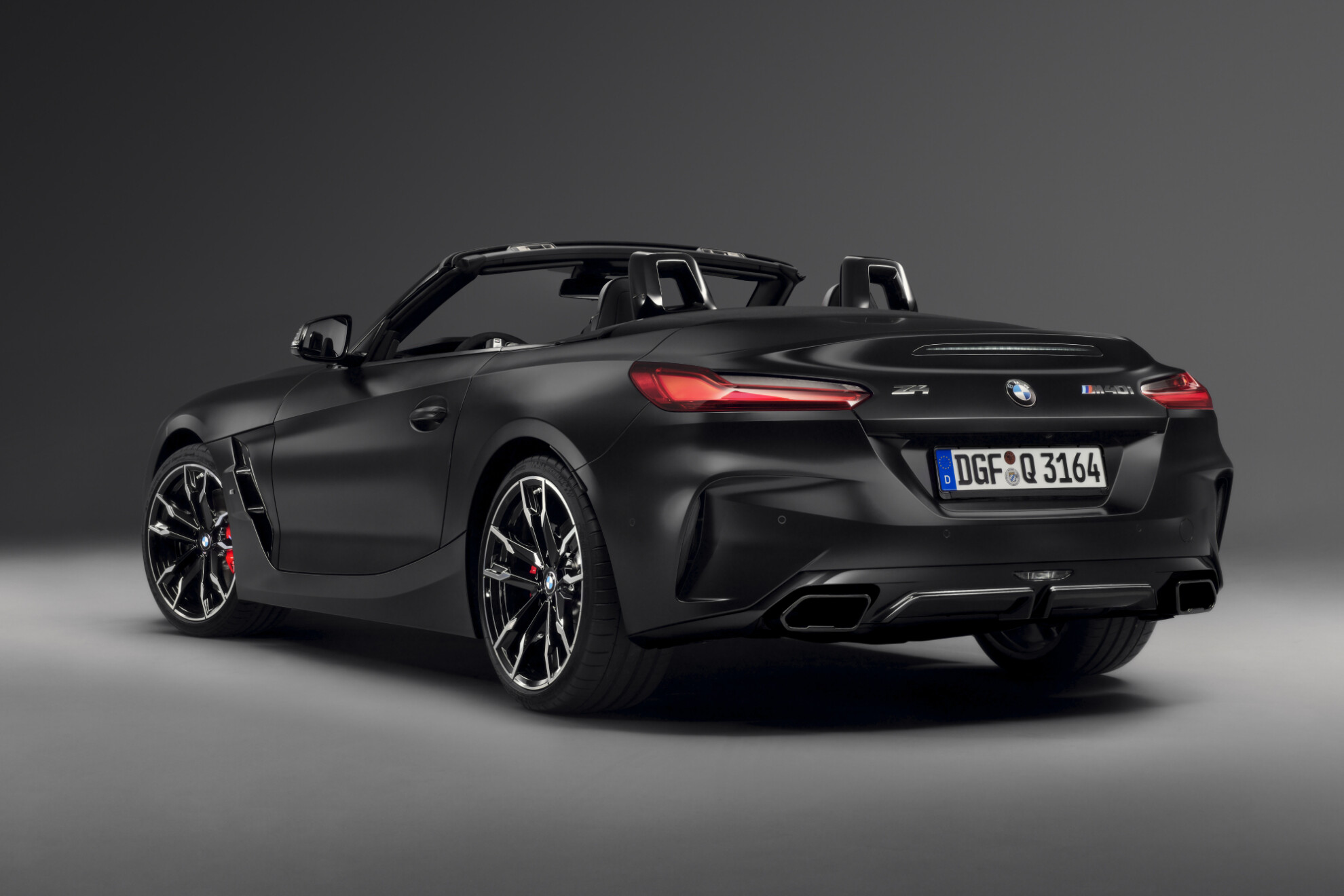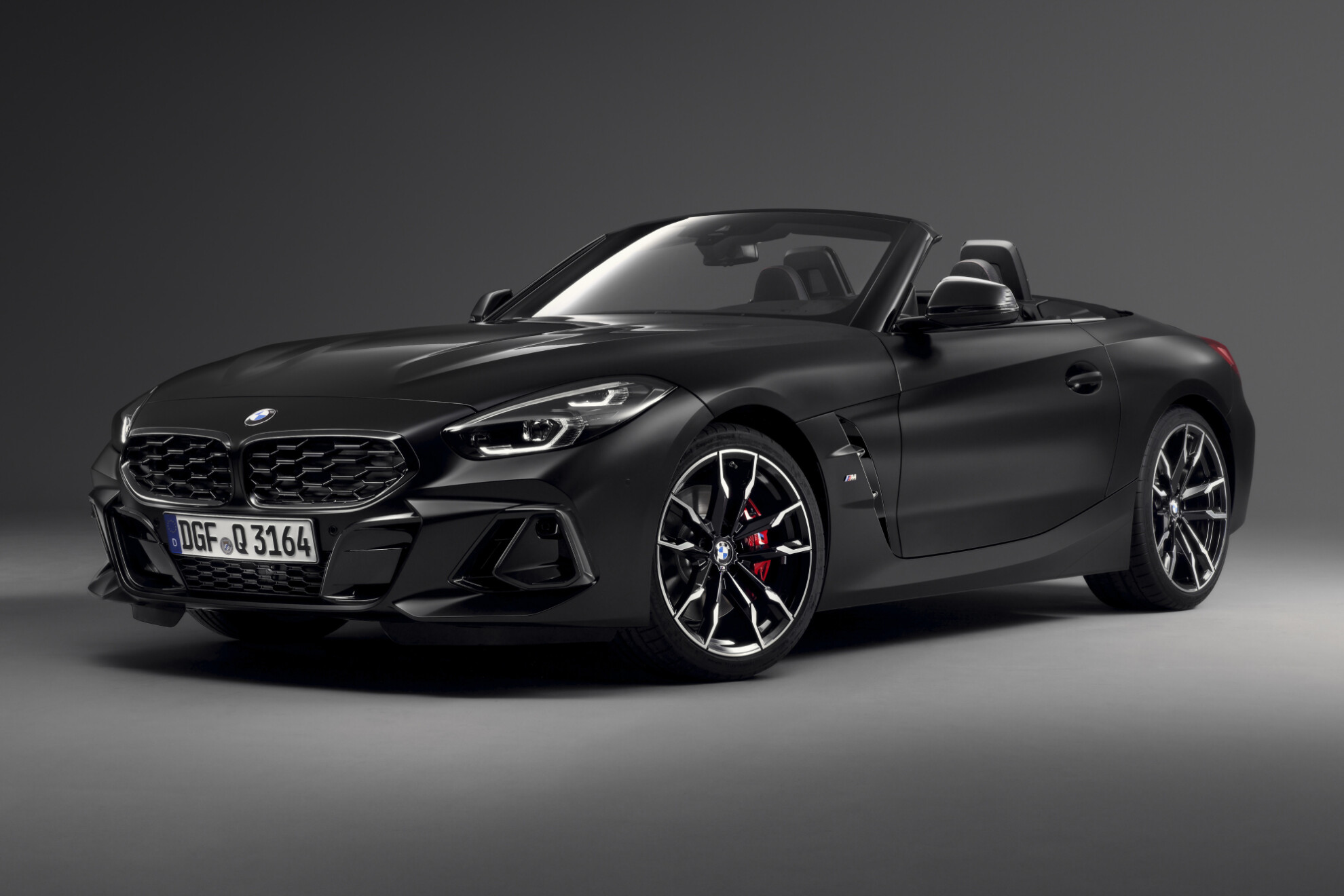 All examples of the BMW Z4 Final Edition come standard with Frozen Black metallic paint and the dark-accented high-gloss Shadowline package for the grille, intake nostrils, mirror caps and exhaust tips. Red brake calipers sit behind the wheels.