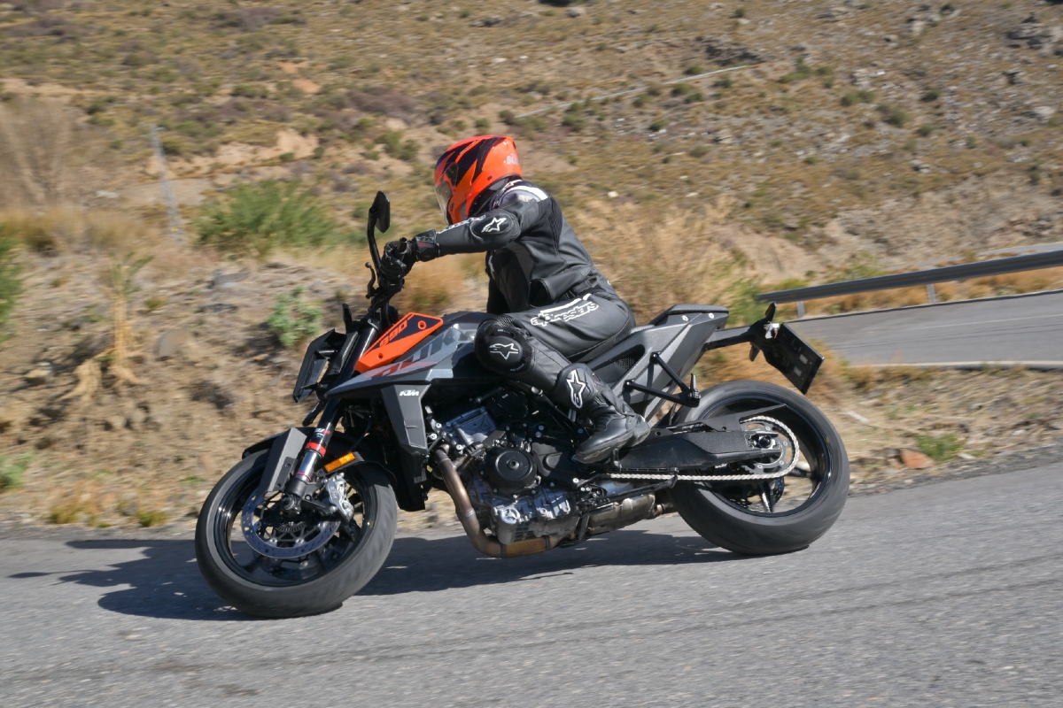 Weather protection proved to have some importance, too. While out touring the mountain roads on the 990 Duke, we endured a stint riding through snow and ice. I’ll be honest, it was a test that my otherwise brilliant Alpinestars SP-8 gloves didn’t pass. My fingers were frozen. Not really the gloves’ fault, though, as the experience was the same for everyone else in the group that wasn’t wearing specific winter gloves. My toes, however, were warm and dry. As they were when we were splashing around a sodden Almeria circuit on the 1390 Super Duke R later that same day.