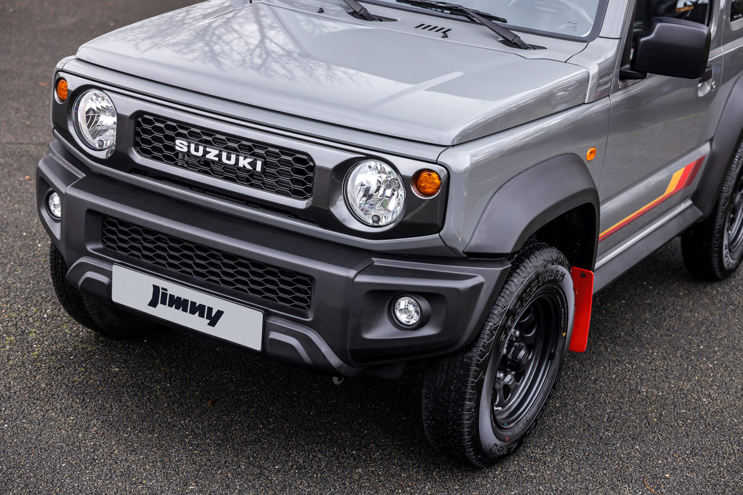 This includes yellow, red and maroon side stripes – similar to the Jimny Heritage sold in Australia, just placed lower – as well as a retro-inspired grille, red mudflaps and a spare wheel cover with a rhinoceros logo, dating back to the 1980s version of the model.