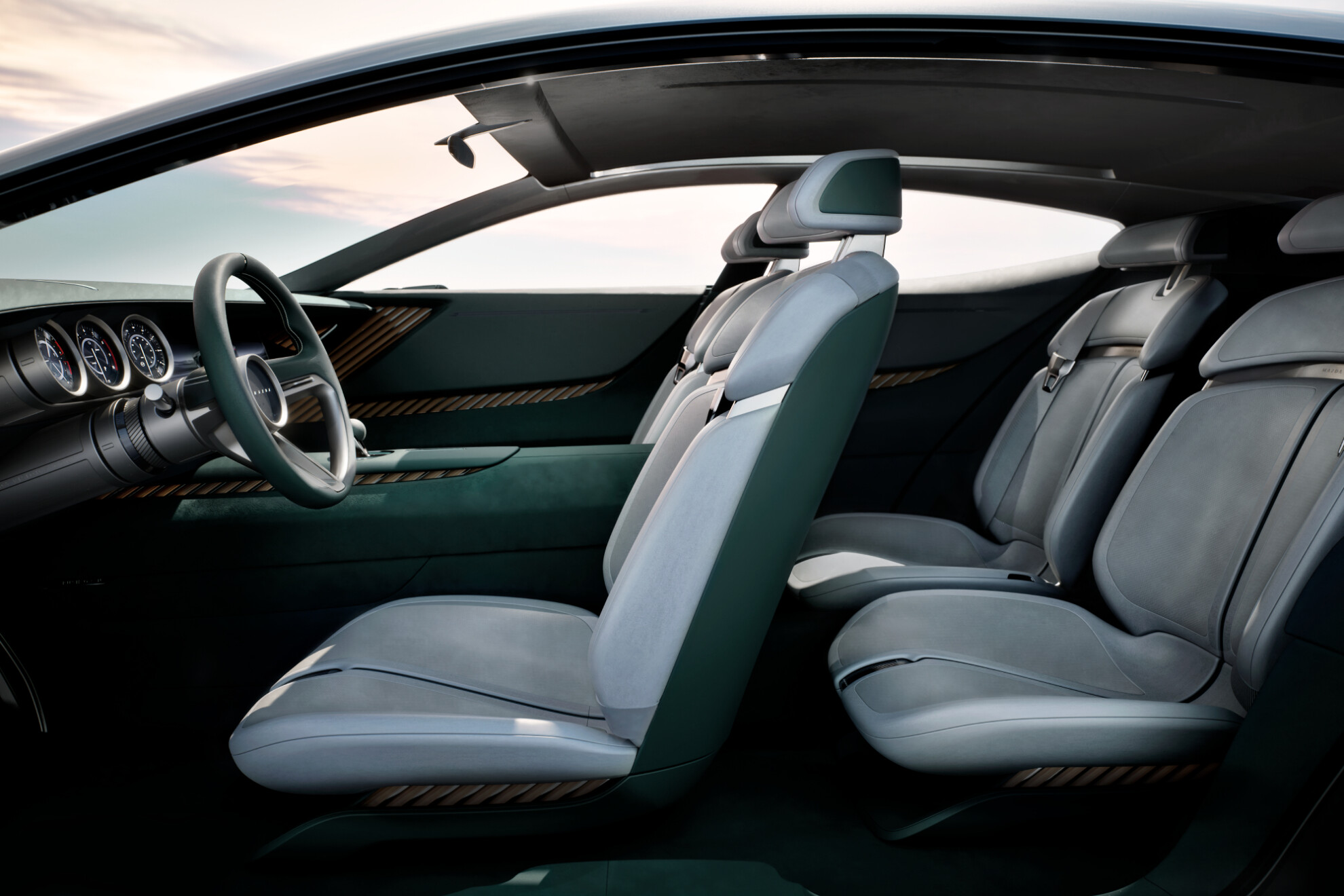 Inside it appears to be a basic affair, with a three-spoke dished steering wheel sitting in front of three large gauges, which are placed alongside a wide display screen, and above a simple centre console.