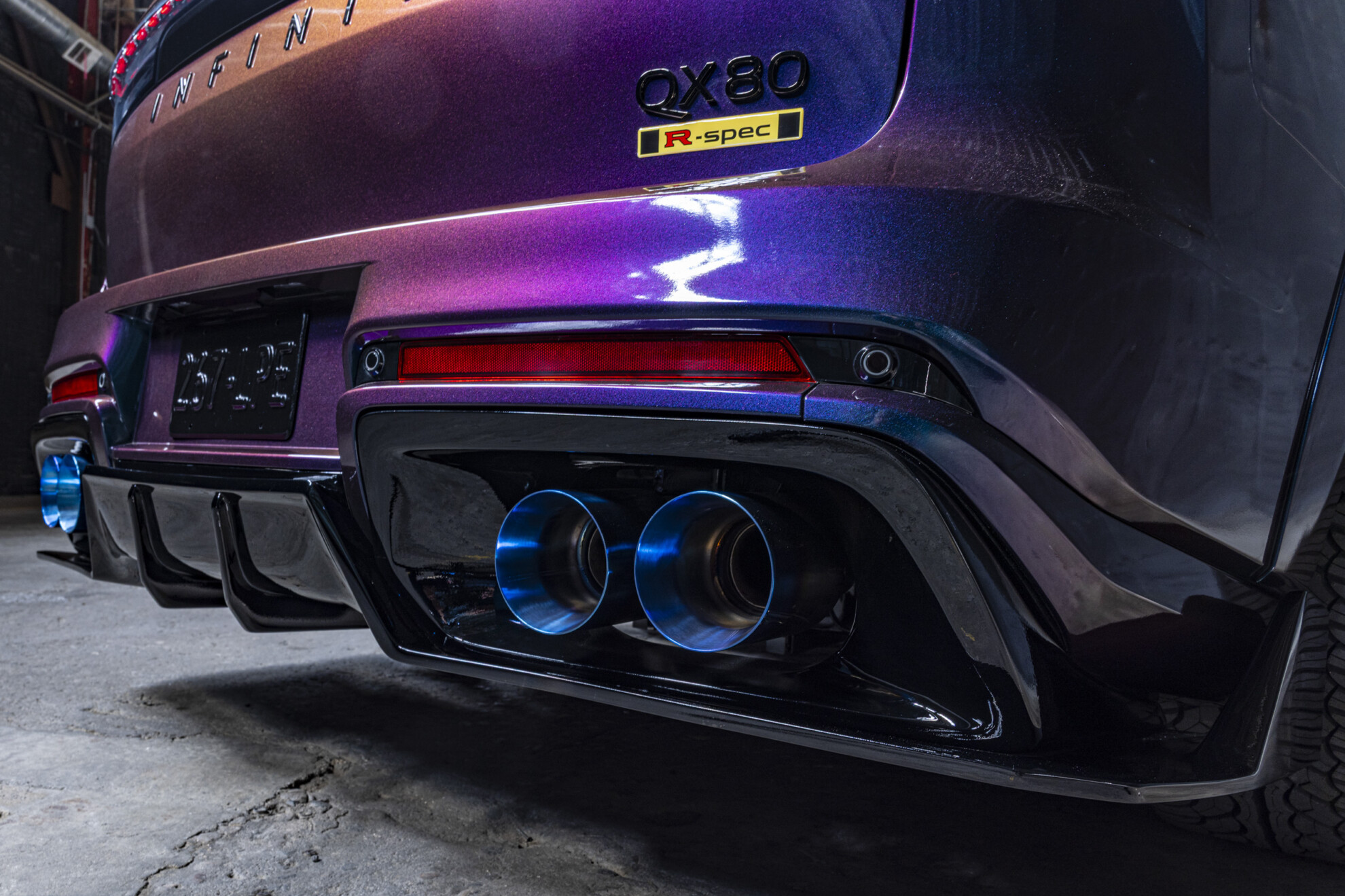 Of course it’s hard to miss the QX80 R-Spec too, thanks to its custom body kit which was inspired by the Nissan GT-R T-Spec Takumi Edition. Most notable is its wrap, a tribute to the ‘Midnight Purple’ finish first introduced on the R34 Skyline GT-R.