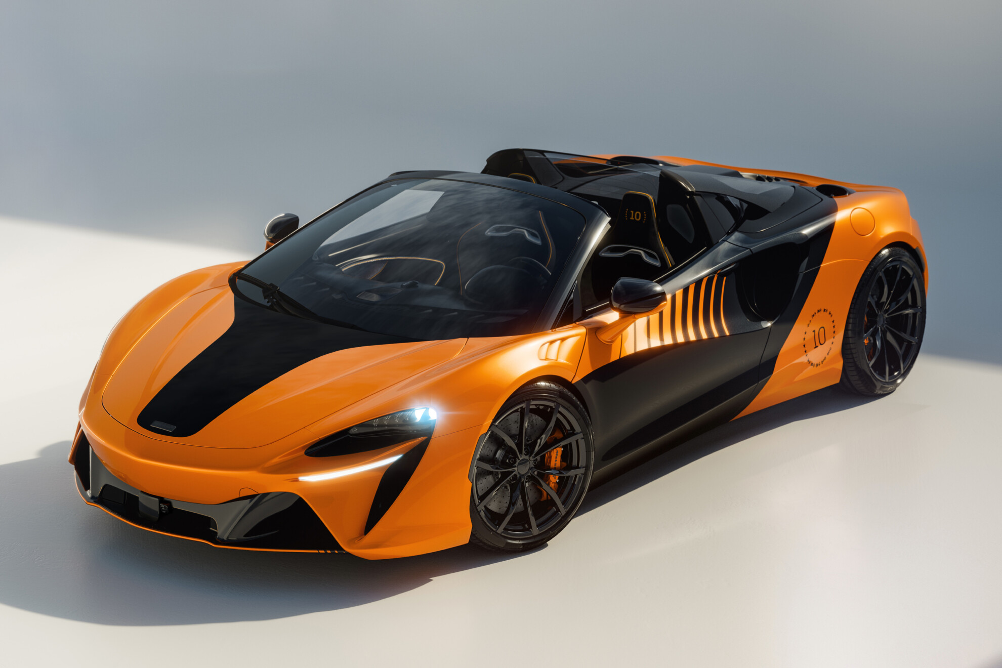 Developed by the McLaren Special Operations (MSO) team, the Artura Spider is finished in Myan Orange with Onyx Black to reflect the livery of the MCL39, complete with ‘10’ motifs to celebrate the team’s 10th Constructor’s Championship, each surrounded in 10 starts with the outlines of every title-winning racer.