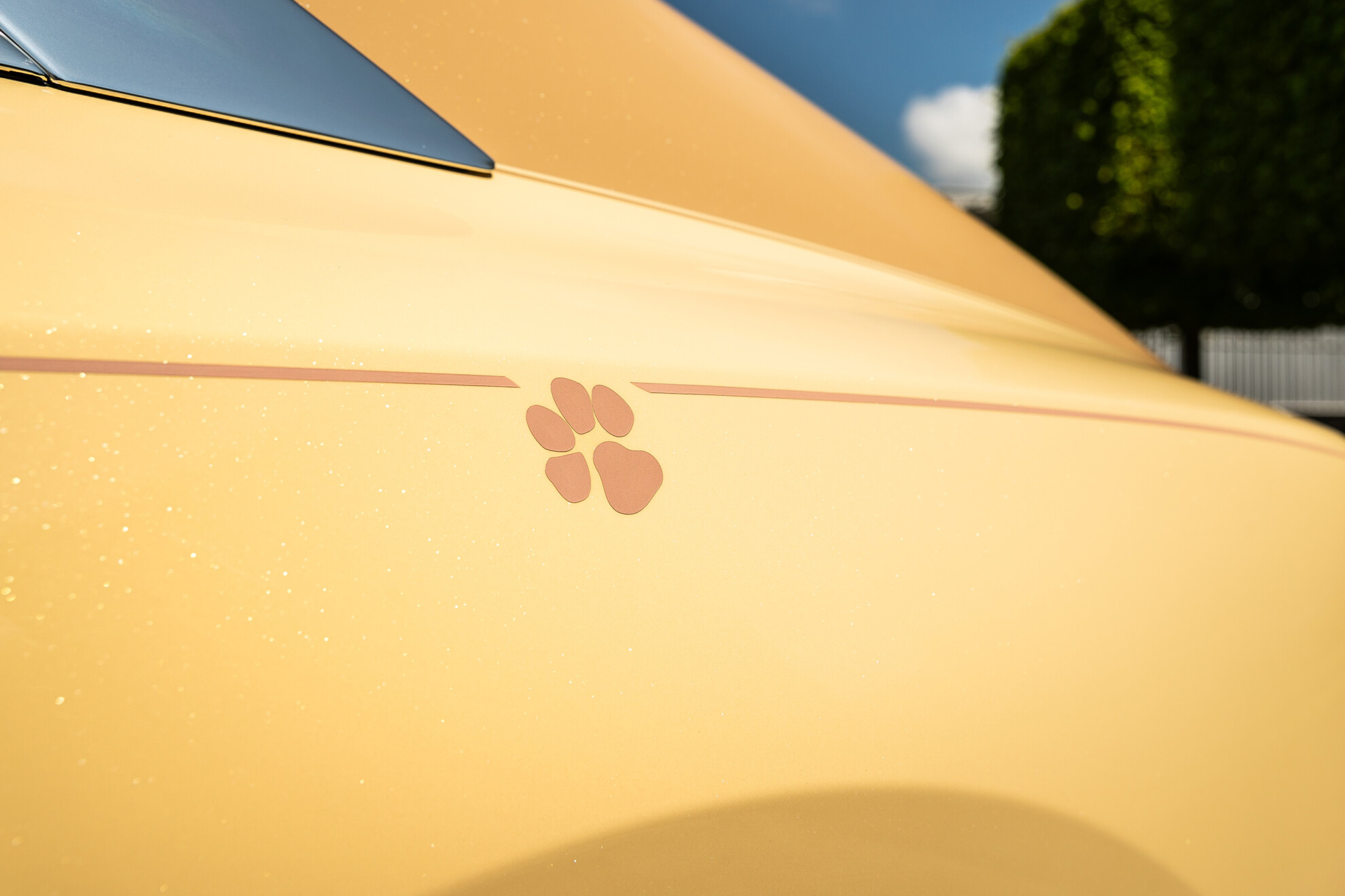 A second-smaller tribute to Bailey is positioned on the passenger side of the dashboard, again featuring a recreation of his paw print, which has been engraved on the Rose Gold scuff plates.