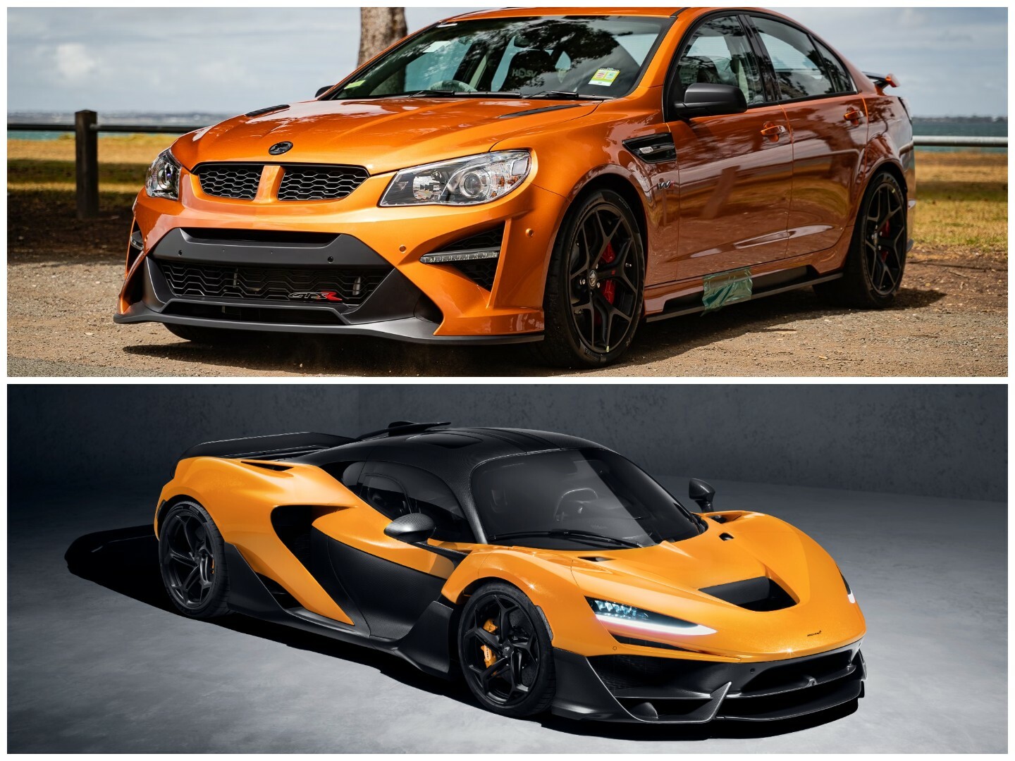The two cars couldn’t be more different (although curiously both were presented in hero colours of similar shades of orange), with the McLaren a clean-sheet hypercar with a hybrid V8 engine and loads of carbon fibre, while the HSV is modified Holden Commodore with a Chevrolet ‘LS9’ supercharged 6.2-litre V8 and no hybrid help in sight.