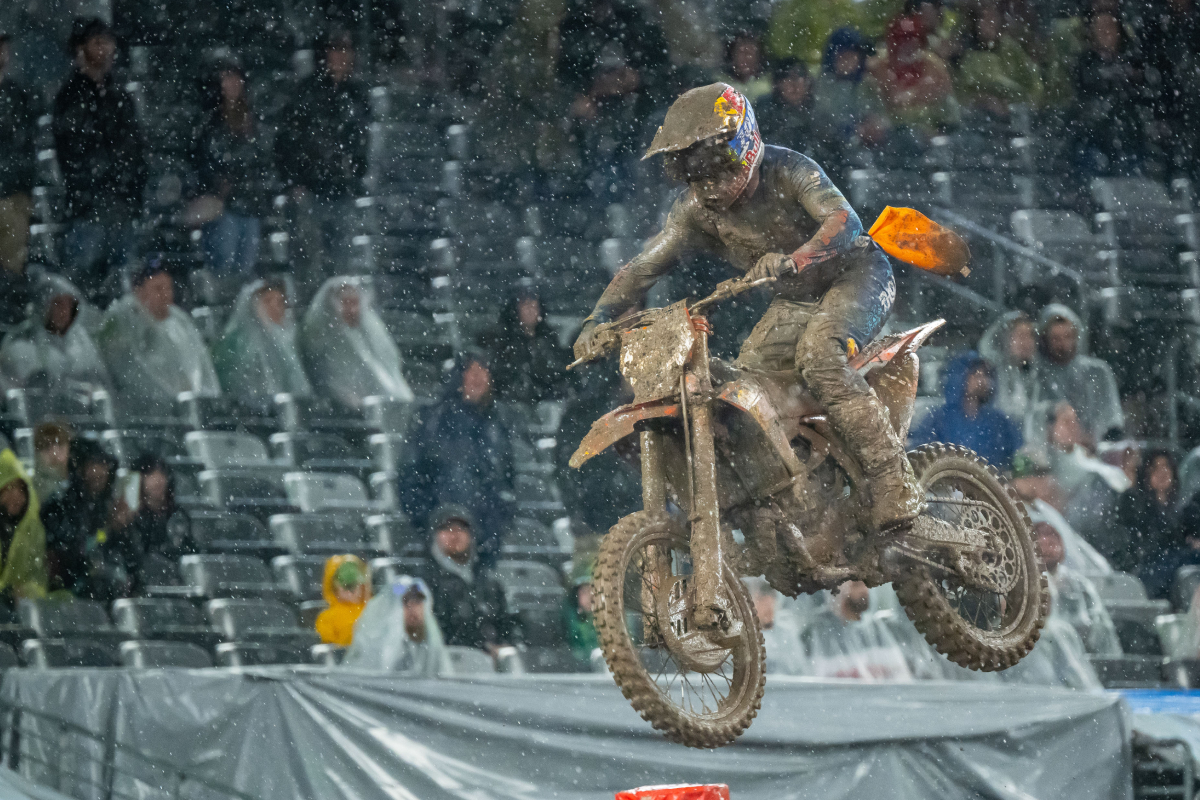 The skies opened and mother nature emerged at round 14 of the 2023 AMA Supercross Championship, making for challenging conditions for the Red Bull KTM Factory Racing team in East Rutherford, where 450SX title challenger Cooper Webb finished in fifth position, while Maximus Vohland claimed fourth and Tom Vialle 14th in the 250SX East/West Showdown.