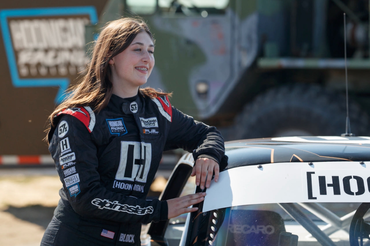 The younger Block has just taken over driving duties in arguably her dad’s most famous car – the 1400hp twin-turbo V8 Ford Mustang ‘Hoonicorn’ – for the Hoonigan YouTube channel’s latest season of ‘Hoonicorn vs The World’.